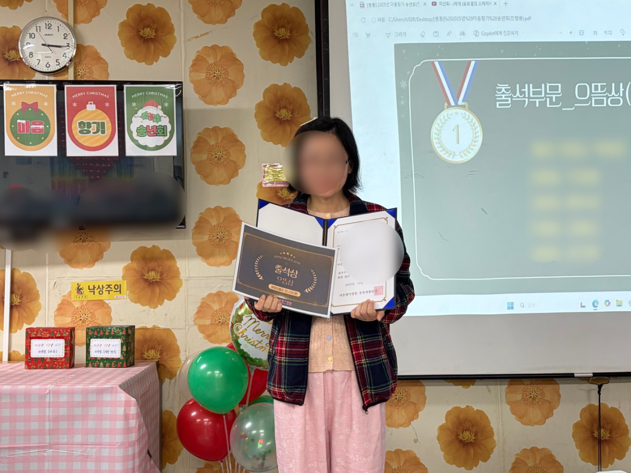 함께 모인 자리에서 올 한 해를 추억하며 마무리하고, 서로의 얼굴을 마주하면서 다양한 생각과 감정들을 주고받았습니다 그리고 1년 동안 적극적으로 재활프로그램에 참여하였거나, 성실한 병동생활을 지속한 환자분들을 시상하며 뜻 깊은 시간을 보내기도 하였습니다