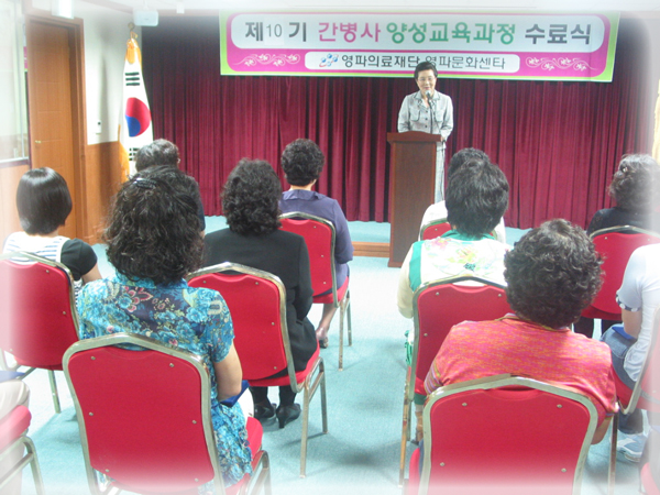 안녕하세요 저는 주변에 치매와 암으로 고통받고 있는 있는 분들이 계셔서 간병사 교육을 받아보기로 했습니다 그래서 여러곳을 알아보다 영파문화센타의 간병사양성교육과정을 접하게 되었습니다. 첫 수업의 강의내용은 간병사의 역할에 대한 내용으로 시작하여 병원장님의 미국 의료시스템와 보건문화에 대하여 평소 알지못했던 많은 정보를 접할 수 있었으며 그 외에도 최영숙 간호과장님을 비롯한 여러 강사분들의 2주간의 유익한 이론강의는 저에게 새롭고 궁금했던 많은 것을 알게 해준 시간이었습니다. 그리고 직접 환자들과 접하며 배우는 임상실습을 하게 되었습니다 처음 5병동 중환자 병동에서 실습을 하며 치매 어르신들을 바라보는 순간 마음이 무거워 처음 저의 어머니가 치매라는 사실을 알게 되었을때의 느낌으로 멍하게 어르신들을 바라볼 수밖에 없었습니다. 그러나 그때 선배 간병사님들의 능숙하고 내 부모처럼 소중히 대하시는 모습을 보며 정말 사랑과 봉사 없이는 이 일을 해내지 못하겠다는 것을 느끼면서 많은 것을 배우게 되었습니다. 그리고 저는 생각했습니다. 정말 어머니께는 나는 어떻게 하였는가? 너무나 답답하고 어이 없던 일들...그때 마다 저는 사랑으로 감싸기보다 어머니를 더 힘들게 하였습니다. 저는 이번 교육을 통해 제 건강이 허락하는한 어머니가 자식에게 쏟는 사랑과 정성으로 모든이의 아픈마음을 보듬어 안을 수 있는 사람이 되리라 제 자신과 여러분들 앞에서 약속을 하겠습니다. 끝으로 이번 10기 간병사양성교육과정을 무사히 수료 할 수 있게 도움을 주신 많은분들께 감사드리며 우리 10기 동기생 여러분들도 수고 많았습니다 이번 인연이 더 좋은 인연으로 발전해나가길 바랍니다 감사합니다.