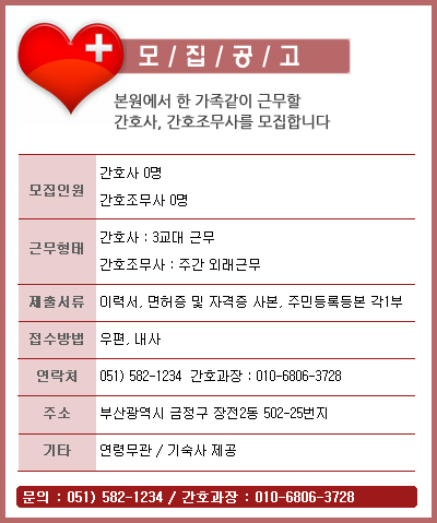 본원에서 한 가족같이 근무할 간호사, 간호조무사를 모집합니다.
