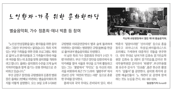 부산 금정구 장전2동 규림병원의 김종천 병원장은 올해로 2번째로 마련하는 별숲음악회의 취지를 이렇게 설명했다. 오는 24일 오후 5시30분 규림병원 야외공연장에서 별과 숲에 둘러싸여 마련하는 음악회는 병원명인 규림(奎林)을 한글로 풀어내어 별숲음악회로 탄생했다.